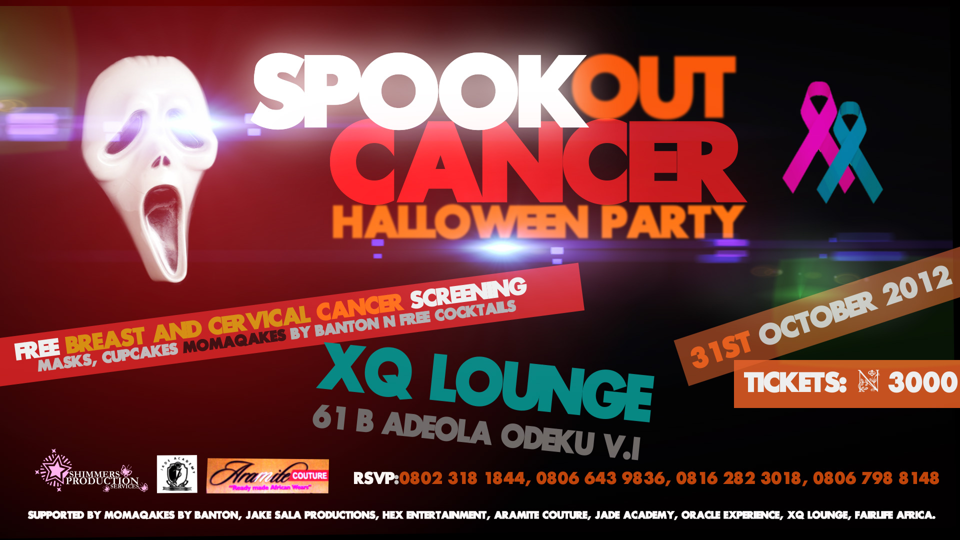 It truly will be a party with a difference. Shimmers is providing free breast and cervical cancer screening for all women in attendance, by well trained and highly professional female doctors. The first 50 guests will get a free mask, welcome cocktail drink and cupcake! The party will hold at 61b Adeola Odeku Rd, Victoria Island, Lagos, from 10pm. The ticket price for the party is N3000 only and is valid for a whole week (to allow more time for screening after the event), so come and spook out cancer! For more information and ticket bookings, please contact Lucia Ikediashi on 002348023181844.